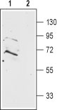 Western blot analysis of rat brain membranes: 1. Anti-Prokineticin Receptor 2 (extracellular) antibody ( APR12955G), (1:200). 2. Anti-Prokineticin Receptor 2 (extracellular) antibody, preincubated with the control peptide antigen.