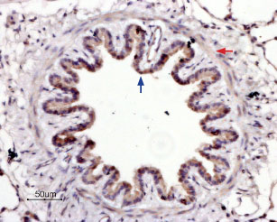 Expression of PAR-4 in rat lung Immunohistochemical staining of rat lung paraffin-embedded sections using Anti-Protease-Activated Receptor-4 (extracellular) antibody (AMM07349G), (1:100). Note that staining is present in the respiratory epithelium of the bronchiole (blue arrow) as well as in the smooth muscle cells of the muscularis mucosae (red arrow). Hematoxilin is used as the counterstain. |