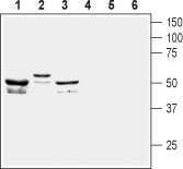 Western blot analysis of mouse brain lysate (lanes 1 and 4), human SHSY-5Y neuroblastoma cell line lysate (lanes 2 and 5) and rat brain membranes (lanes 3 and 6): 1-3. Anti- K 5.1 antibody ( AMM06228G), (1:400). 4-6. Anti-K 5.1 antibody, preincubated with the control peptide antigen. |