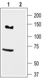 Western blot analysis of rat brain lysate: 1. Anti- K 11.3 (erg3) antibody ( AMM06221G), (1:300). 2. Anti- K 11.3 (erg3) antibody, preincubated with the control peptide antigen.
