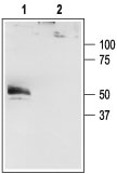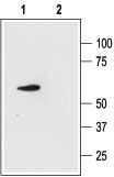 Western blot analysis of HEK-293-K 2P 4.1 transfected cells: 1. Anti-K 2P 4.1 (TRAAK) antibody ( AMM06055G), (1:200). 2. Anti-K 2P 4.1 (TRAAK) antibody, preincubated with the control peptide antigen.