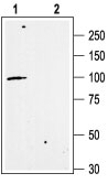 Western blot analysis of rat brain membranes: 1. Anti- K Ca 2.3 (SK3) (C-term) antibody ( AMM06064G), (1:200). 2. Anti-K Ca 2.3 (SK3) (C-term) antibody, preincubated with the control peptide antigen. |