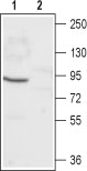 Western blot analysis of rat eye lysate: 1. Anti-CNGA1 antibody ( APR11604G), (1:200). 2. Anti-CNGA1 antibody, preincubated with the control peptide antigen. |