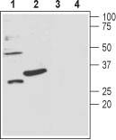 Western blot analysis of mouse brain lysates (lanes 1 and 3) and rat pancreas membranes (lanes 2 and 4): 1-2. Anti- sloβ3 (KCNMB3) (extracellular) antibody ( APR13405G), (1:1000). 3-4. Anti-sloβ3 (KCNMB3) (extracellular) antibody, preincubated with the control peptide antigen. |