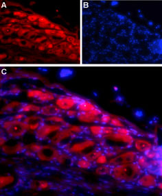 Expression of Neuroligin 1 in rat DRG Immunohistochemical staining of adult rat dorsal root ganglion (DRG) using Anti-Neuroligin 1 (extracellular) antibody ( AMM06641G) followed by anti-rabbit-AlexaFluor-594 secondary antibody. A. Neuroligin 1 labeling (red) appears in the cell bodies of the DRG neurons. B. Nuclear staining using DAPI as the counter stain (blue). C. Merged image of A and B. |
