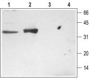 Western blot analysis of rat brain (lanes 1 and 3) and kidney (lanes 2 and 4) membranes: 1, 2. Anti-Syntaxin 3 antibody ( APR13641G), (1:200). 3, 4. Anti-Syntaxin 3 antibody, preincubated with the control peptide antigen. |