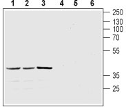 Western blot analysis of mouse brain (lanes 1 and 4) rat brain (lanes 2 and 5) and rat cerebellum (lanes 3 and 6) lysates: 1-3. Anti-Melatonin Receptor Type 1 antibody ( AMM06372G), (1:200). 4-6. Anti-Melatonin Receptor Type 1 antibody, preincubated with the control peptide antigen.