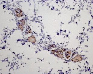 Expression of MC5R in rat skin Immunohistochemical staining of paraffin embedded rat skin section using Anti-Melanocortin Receptor 5 antibody ( AMM06371G), (1:100). MC5R staining is present in sebaceous glands. Hematoxilin is used as the counterstain. |