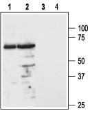Western blot analysis of mouse (lanes 1 and 3) and rat (lanes 2 and 4) brain lysates: 1, 2. Anti-Melanocortin Receptor 3 (extracellular) antibody ( AMM06370G), (1:200). 3, 4. Anti-Melanocortin Receptor 3 (extracellular) antibody, preincubated with the control peptide antigen.