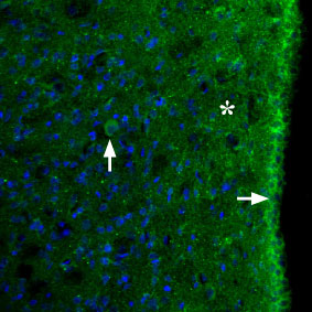 Expression of MC3R in rat brain Immunohistochemical staining of perfusion-fixed frozen rat brain sections using Anti-Melanocortin Receptor 3 (extracellular) antibody ( AMM06370G), (1:100). Expression (green fluorescence) appears in the hypothalamic periventricular region (horizontal arrow), in some nerve cells (vertical arrow), and in the neuropil (asterisk). Hoechst 33342 is used as the counterstain (blue).