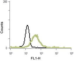 Indirect flow cytometry analysis in human promyelocytic leukemia HL-60 cells. Cells + FITC-conjugated goat anti-rabbit antibody. Cells + Anti-Melanocortin Receptor 3 (extracellular) antibody ( AMM06370G), (1:40) + FITC conjugated goat anti-rabbit antibody. |