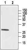 Western blot analysis of rat adrenal lysate: 1. Anti-Melanocortin Receptor 2 (extracellular) antibody ( APR08419G), (1:400). 2. Anti-Melanocortin Receptor 2 (extracellular) antibody, preincubated with the control peptide antigen.