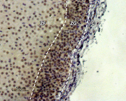 Expression of MC2R in rat adrenal gland Immunohistochemical staining of paraffin embedded rat adrenal cortex section using Anti-Melanocortin Receptor 2 (extracellular) antibody ( APR08419G), (1:100). Shown are the capsule (C), the zona glomerulosa (ZG) and the zona fasciculata (ZF) of the adrenal cortex. Note that the staining brown) is specific for cells of the adrenal gland while no staining is present in the dense connective tissue of the capsule. Color reaction was obtained with DAB. H&E is used as the counterstain. |