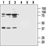 Western blot analysis of human normal skin fibroblast cell line Malme-3 (lanes 1 and 4) and human malignant melanoma cell lines Malme-3M (lanes 2 and 5) and A875 (lanes 3 and 6): 1, 2, 3. Anti-Melanocortin Receptor 1 antibody ( APR08418G), (1:500). 4, 5, 6. Anti-Melanocortin Receptor 1 antibody, preincubated with the control peptide antigen