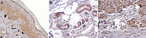 Expression of MC1R in normal skin and melanoma Immunohistochemical staining of paraffin embedded normal skin and melanoma sections using Anti-Melanocortin Receptor 1 antibody ( APR08418G) (1:100). MCR1 staining (red-brown color is highly specific in A. epidermal cells, B. eccrine sweat gland cells and C. melanoma cells. Color reaction was obtained with DAB. Hematoxilin is used as the counterstain. |