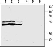 Western blot analysis of acute monocytic leukemia THP-1 (lanes 1 and 4), promyelocytic leukemia HL-60 (lanes 2 and 5) and chronic myelogenous leukemia K562 (lanes 3 and 6) human cell lysates: 1- 3. Anti-Human CysLTR2 (extracellular) antibody ( APR12421G), (1:200). 4- 6. Anti-Human CysLTR2 (extracellular) antibody, preincubated with the control peptide antigen.