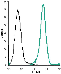 Indirect flow cytometry analysis in live intact acute monocytic leukemia (THP-1) cells: Control cells + goat anti-rabbit-AlexaFluor-488. Cells + Anti-Human CysLTR2 (extracellular) antibody ( APR12421G), (1:50) + goat anti-rabbit-AlexaFluor-488. |