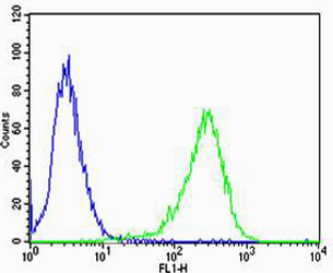 Flow cytometric analysis of Jurkat cells using Park7 (DJ-1) Antibody(green, APR12422G) compared to an isotype control of rabbit IgG(blue). APR12422G was diluted at 1:35 dilution. An Alexa Fluor? 488 goat anti-rabbit lgG at 1:400 dilution was used as the secondary antibody.