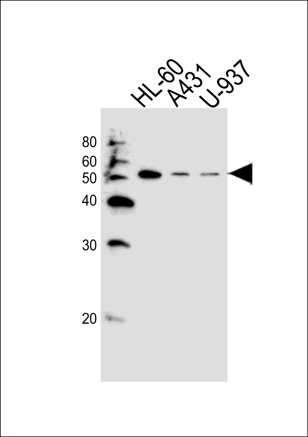 Western blot analysis of lysates from HL-60, A431, U-937 cell line (from left to right), using HRH4 Antibody( APR12422G). APR12422G was diluted at 1:1000 at each lane. A goat anti-rabbit IgG H&L(HRP) at 1:5000 dilution was used as the secondary antibody. Lysates at 35ug per lane.