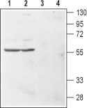 Western blot analysis of human chronic myelogenous leukemia (K562) (lanes 1 and 3) and human promyelocytic leukemia (HL-60) (lanes 2 and 4) cell lysates: 1, 2. Anti-Human H4 Histamine Receptor (extracellular) antibody ( APR12422G), (1:400). 3, 4. Anti-Human H4 Histamine Receptor (extracellular) antibody, preincubated with the control peptide antigen. |