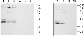 Western blot analysis of rat hippocampus, DRG (lanes 2 and 5), brain (lanes 3 and 6), mouse brain (lanes 7 and 9) and human prostate carcinoma LNCaP cell lysates: 1, 2, 3, 7, 8. Anti-Galanin Receptor Type 2 antibody ( APG03317G), (1:200). 4, 5, 6, 9, 10. Anti-Galanin Receptor Type 2 antibody, preincubated with the control peptide antigen