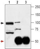 Immunoprecipitation of rat cerebellum lysates: 1. Cerebellum lysates. 2. Cerebellum lysates + Anti-AMPA Receptor 3 (GluA3) (extracellular) antibody ( APR11398G) + protein A beads. 3. Cerebellum lysates + pre-immune rabbit serum + protein A beads. Black arrow indicates the AMPA Receptor 3 (GluR3) while the red arrow shows the IgG heavy chain. Immunoblot was performed with Anti-AMPA Receptor 3 (GluA3) (extracellular) antibody ( APR11398G) .