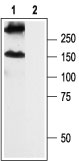 Western blot analysis of rat brain membrane: 1. Anti-GABA(B) R2 antibody ( APR11955G), (1:200). 2. Anti-GABA(B) R2 antibody preincubated with the control peptide antigen.