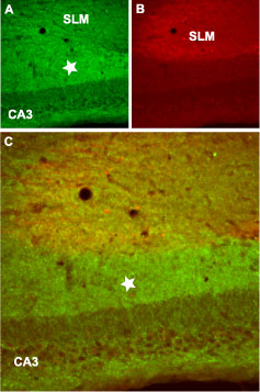 Expression of GABA(B) R2 in mouse hippocampus Immunohistochemical staining of mouse hippocampus frozen sections using Anti-GABA(B) R2 antibody ( APR11955G ), (1:100). A. GABA(B) R2 staining (green) is detected in layers including the stratum lacunosum moleculare (SLM) and stratum radiatum of the CA3 layer (star). B. Staining with mouse anti-GAP43 antibody (red) sets apart the SLM. C. Confocal merge suggests the presence of GABA(B) R2 in layers, but not in pyramidal neurons. |