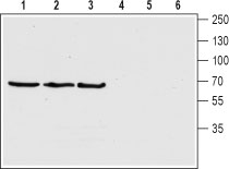 Western blot analysis of human SH-5YSY neuroblastoma cell lysate (lanes 1 and 4), rat (lanes 2 and 5) and mouse (lanes 3 and 6) brain lysates: 1-3. Anti-Choline Transporter (CHT) (extracellular) antibody ( APR11584G), (1:200). 4-6. Anti-Choline Transporter (CHT) (extracellular) antibody, preincubated with the control peptide antigen.