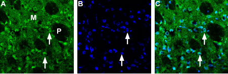 Expression of Choline Transporter in rat striatum Immunohistochemical staining of rat frozen brain sections using Anti-Choline Transporter (CHT) (extracellular) antibody ( APR11584G) (1:200). A. Choline Transporter expression (green) is detected in the matrix (M), but not in the patches (P). B. DAPI (blue) staining provides general cellular staining. C. merge of A and B shows that Choline Transporter appears in a subset of striatal neurons (arrows provide examples).
