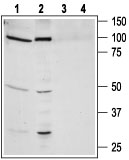Western blot analysis of rat (lanes 1 and 3) and mouse (lanes 2 and 4) brain lysates: 1, 2. Anti-Bombesin Receptor 1 antibody ( APR15164G), (1:1000). 3, 4. Anti-Bombesin Receptor 1 antibody, preincubated with the control peptide antigen.