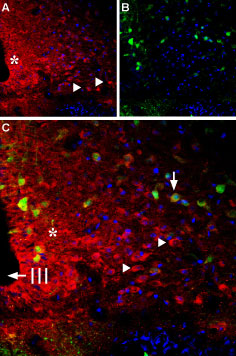Expression of Bombesin Receptor 1 in rat hypothalamus Immunohistochemical staining of frozen rat hypothalamus sections using Anti-Bombesin Receptor 1 antibody ( APR15164G), (1:200). A. Staining (red) appears in the neuropil near the ventricle (asterisk) and in neurons (triangles). Calbindin D28k staining (green) appears in neurons. Merge of (A) and (B) shows co-expression of Bombesin Receptor 1 and Calbindin in a few neurons (vertical arrow). DAPI is used as the counterstain. |