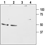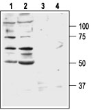 Western blot analysis of human DU-145 (lanes 1 and 3) and PC-3 (lanes 2 and 4) prostate carcinoma cell lines: 1, 2. Anti-Bombesin Receptor 2 (extracellular) antibody ( AMM05633G), (1:200). 3, 4. Anti-Bombesin Receptor 2 (extracellular) antibody, preincubated with the control peptide antigen.