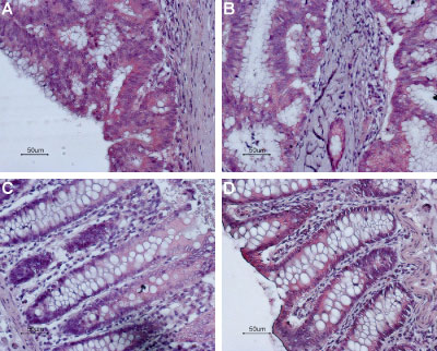 Expression of Bombesin Receptor 2 in human colon Immunohistochemical staining of paraffin-embedded human colon using Anti-Bombesin Receptor 2 (extracellular) antibody ( AMM05633G), (1:50). (A and B) Human colon showing malignant growth. Staining is specific for epithelium-derived malignant cells. (C and D) Normal colon, staining is specific for absorptive epithelial cells in the crypts of Lieberkuhn. Histofine (pink) is used for the color reaction. Hematoxilin is used as the counterstain. |