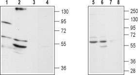 Western blot analysis of rat brain stem (lanes 1 and 3), mouse brain (lanes 2 and 4), SH-SY5Y (lanes 5 and 7) and Jurkat (lanes 6 and 8) lysates: 1, 2, 5, 6. Anti-α1D-Adrenoceptor (extracellular) antibody ( APR11386G), (1:200). 3, 4, 7, 8. Anti-α1D-Adrenoceptor (extracellular) antibody, preincubated with the control peptide antigen.
