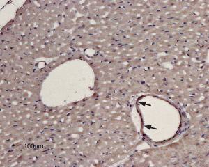 Expression of α1D-Adrenoceptor in rat heart Immunohistochemical staining of rat heart paraffin embedded sections using Anti-α1D-Adrenoceptor (extracellular) antibody ( APR11386G), (1:100). α1D-Adrenoceptor is expressed in cardiomyocytes of the myocardium and in the smooth muscle of the blood vessels (arrows). Hematoxilin is used as the counterstain.