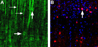 Expression of α1D-Adrenoceptor in rat neocortex Immunohistochemical staining of α1D-Adrenoceptor in rat neocortex using Anti-α1D-Adrenoceptor (extracellular) antibody ( APR11386G). A. Most intense staining of α1D-Adrenoceptor (green) appears in apical dendrites (thin horizontal arrows) but also in the soma (thick horizontal arrow). Few cortical interneurons express α1D-Adrenoceptor. B. The same section was also stained for parvalbumin and one cell (marked with a vertical arrow) also expresses α1D-Adrenoceptor. |