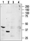 Western blot analysis of rat brain (lanes 1,3) and rat kidney (lanes 2,4) lysates: 1,2. Anti-A1 Adenosine Receptor antibody ( AMM05522G), (1:200). 3,4. Anti-A1 Adenosine Receptor antibody, preincubated with the control peptide antigen.