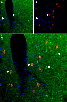 Expression of A1 Adenosine Receptor in rat medial septum Immunohistochemical staining of rat medial septum frozen section using Anti-A1 Adenosine Receptor antibody ( AMM05522G). A. A1 Adenosine Receptor (green) appears in neurons (right pointing triangles). B. Parvalbumin staining (red) appears in medial septal neurons. C. Confocal merge of demonstrates expression of A1 Adenosine Receptor in a subset of medial septal neurons. |