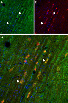 Expression of A1 Adenosine Receptor in rat cortex Immunohistochemical staining of rat cortex frozen section using Anti-A1 Adenosine Receptor antibody ( AMM05522G). A. A1 Adenosine Receptor (green) appears in neurons (triangles) and in astrocytes (arrows). B. Parvalbumin staining (red) appears in cortical interneurons. C. Confocal merge of images demonstrates the existence of A1 Adenosine Receptor in a subset of cortical interneurons and astrocytes.