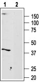 Western blot analysis of Malme-3M cell lysate: 1. Anti-A3 Adenosine Receptor antibody ( APG01407G), (1:200). 2. Anti-A3 Adenosine Receptor antibody, preincubated with the control peptide antigen.