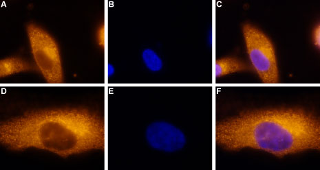 Expression of A3 Adenosine Receptor in a human melanoma cell line Immunocytochemical staining of paraformaldehyde-fixed and permeabilized human melanoma cells (A2058). A, D. Cells were stained using Anti-A3 Adenosine Receptor antibody ( APG01407G), (1:100), followed by goat anti-rabbit AlexaFluor-555 secondary antibody. B, E. Nuclear fluorescence staining of cells using the membrane-permeable DNA dye Hoechst 33342. C. Merged image of panels A and B. F. Merged image of panels D and E. |