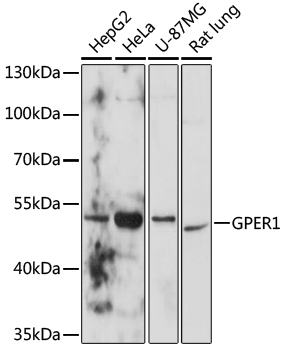 Western blot analysis of extracts of various cell lines, using GPER1 antibody.