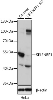 Western blot analysis of extracts from normal (control) and SELENBP1 knockout (KO) HeLa cells, using SELENBP1 antibody.