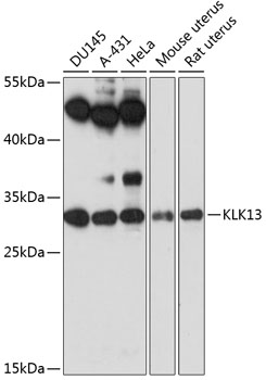 Western blot analysis of extracts of various cell lines, using KLK13 antibody. |