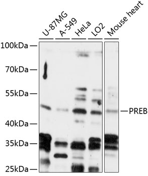 Western blot analysis of extracts of various cell lines, using PREB antibody. |