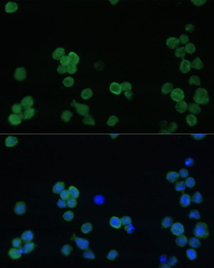 Immunofluorescence analysis of THP-1 cells using GP1BA Polyclonal Antibody. |