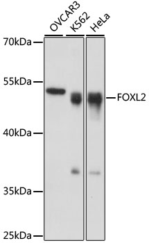 Western blot analysis of extracts of various cell lines, using FOXL2 antibody. |