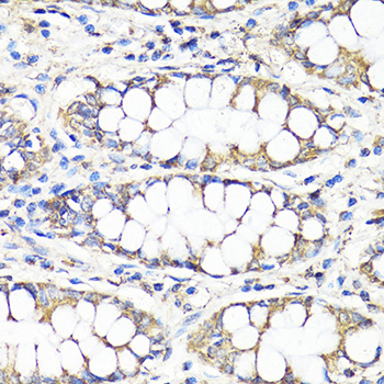 Immunohistochemistry of paraffin-embedded human colon using TGFB1 antibody.
