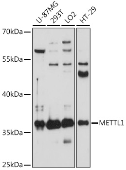 Western blot analysis of extracts of various cell lines, using METTL1 antibody. |